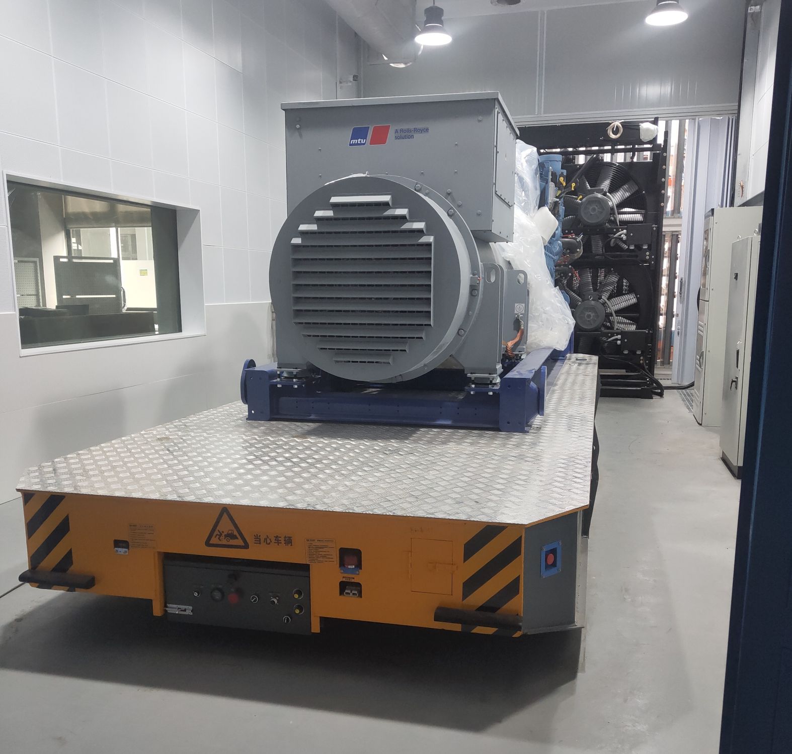 本案例是應(yīng)用于發(fā)電機(jī)組廠家車間內(nèi)完成產(chǎn)品成型后在檢測(cè)、試驗(yàn)、倉(cāng)儲(chǔ)等工位的轉(zhuǎn)運(yùn),工位處于不同車間,路途中有轉(zhuǎn)彎,有坡道;選用無(wú)軌電動(dòng)轉(zhuǎn)運(yùn)平車,大容量蓄電池組供電,車體規(guī)格較大,為適應(yīng)現(xiàn)場(chǎng)較狹窄通道,不至于發(fā)生剮蹭通道邊其它設(shè)備狀況,車體做了倒角處理,并含有聲光報(bào)警、遇障礙物停止、觸碰式開關(guān)等安全警示裝置。