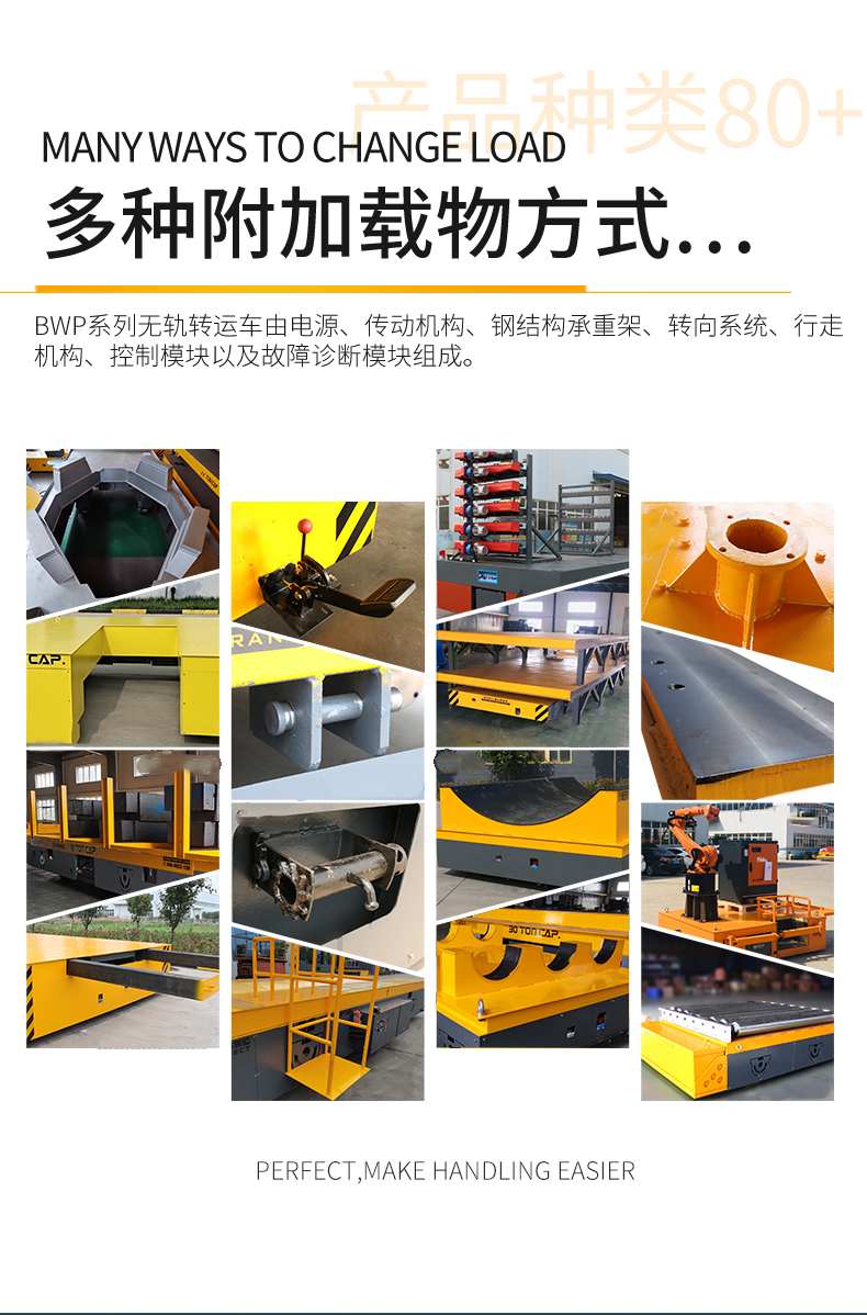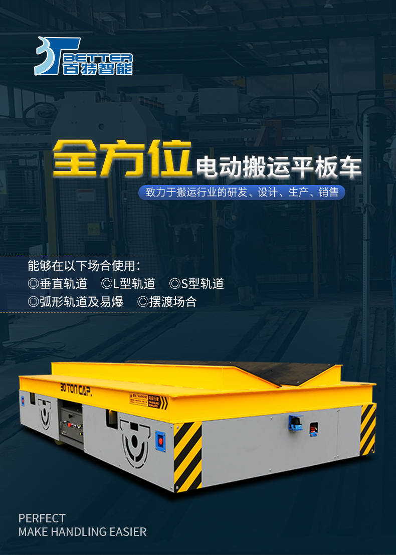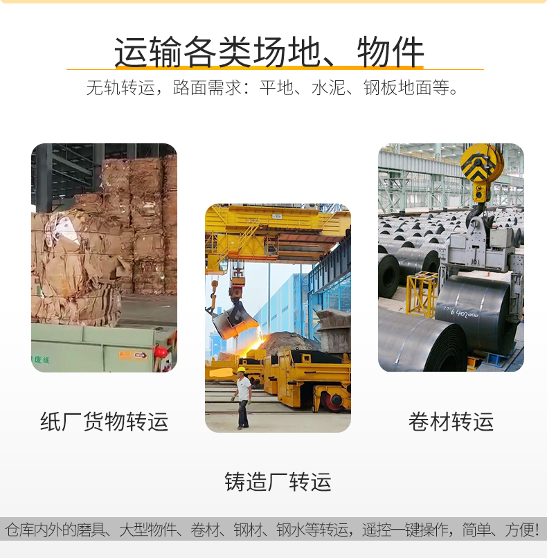 BZH型無軌搬運車是一種以蓄電池或電纜為動力源的車間內(nèi)運輸車輛。又稱臺車、過跨車、地爬車。該車具有結(jié)構(gòu)緊湊、操作方便、可橫縱移動、調(diào)速性能好及污染低、運輸效率高等特點。該車型外形尺寸小,也可進入空間小的倉庫、彎道完成物料運輸,可減輕工人的勞動強度,提高生產(chǎn)效率。作為短距離運輸工具得到廣泛應(yīng)用,也可作為車間內(nèi)部配合吊車運輸重物過跨之用。 該車型采用是一種以蓄電池或電纜為動力源,電壓可有24V、36V、48V、72V、110V。一般蓄電池安裝在平車內(nèi)部,電源通過電氣控制系統(tǒng),給電機提供電力,使平車實現(xiàn)啟動、
